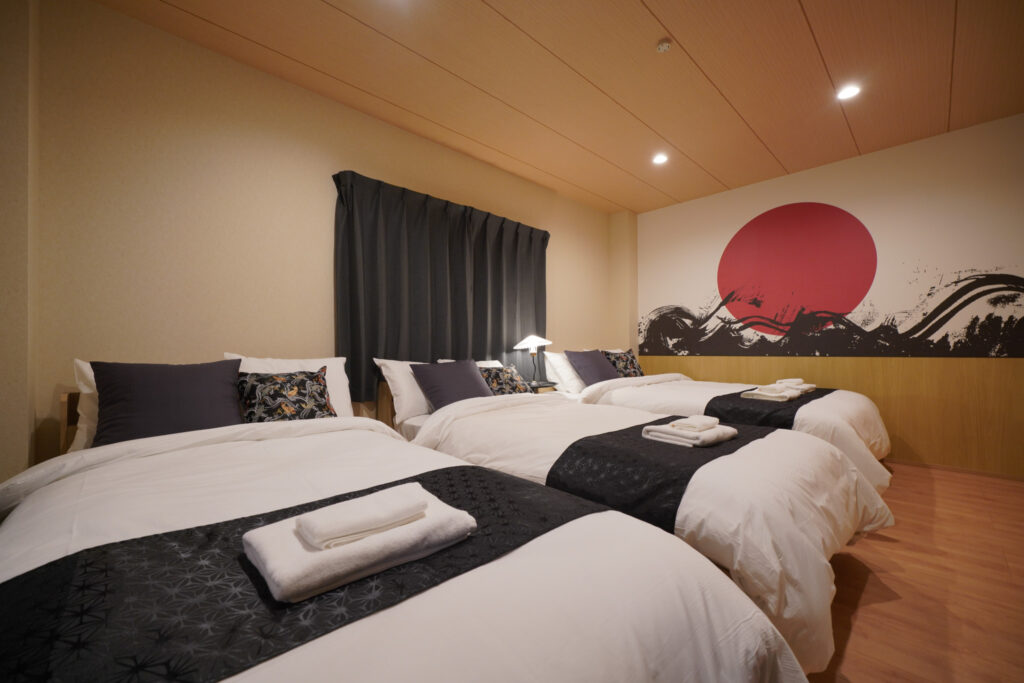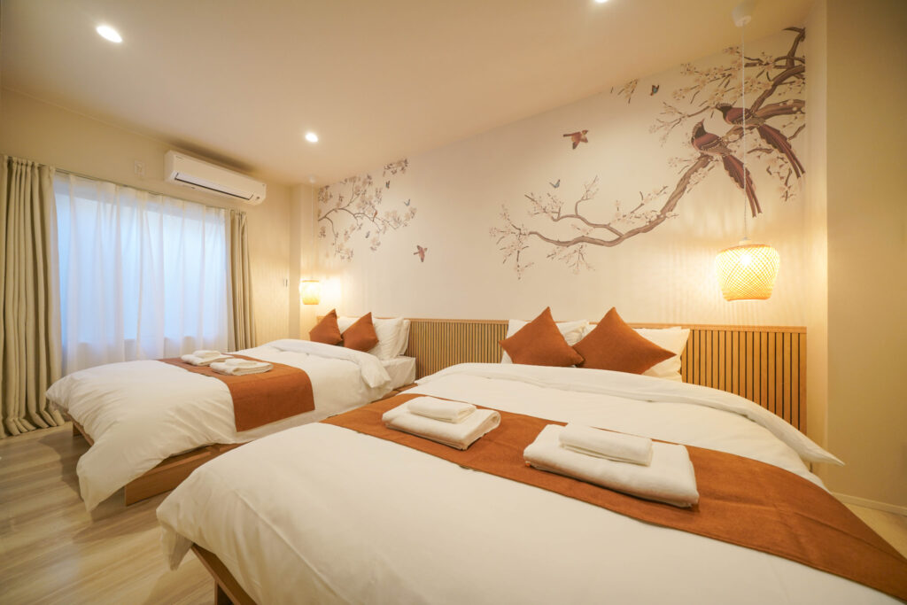 2階から4階までの3フロア構成で、最大6名まで宿泊可能となっています。ベッドルームは2部屋、ダブルベッド3台を備えており、ダブルベッドに2名ずつ宿泊する想定で6名まで快適に滞在可能です。