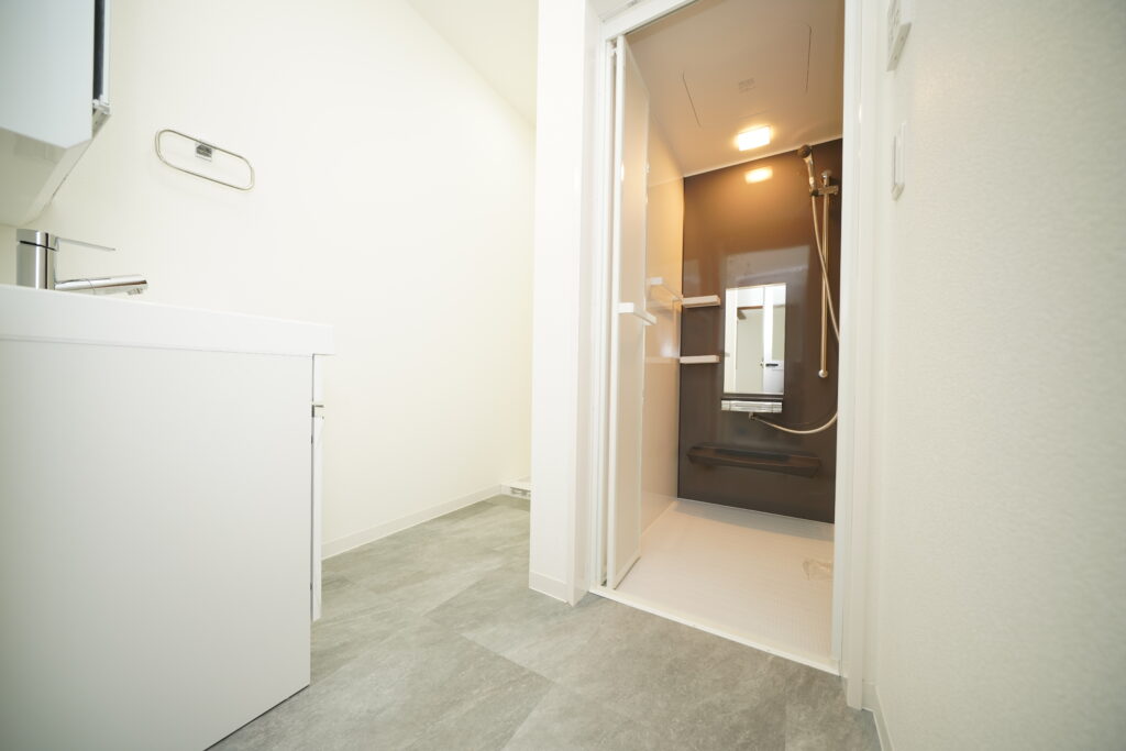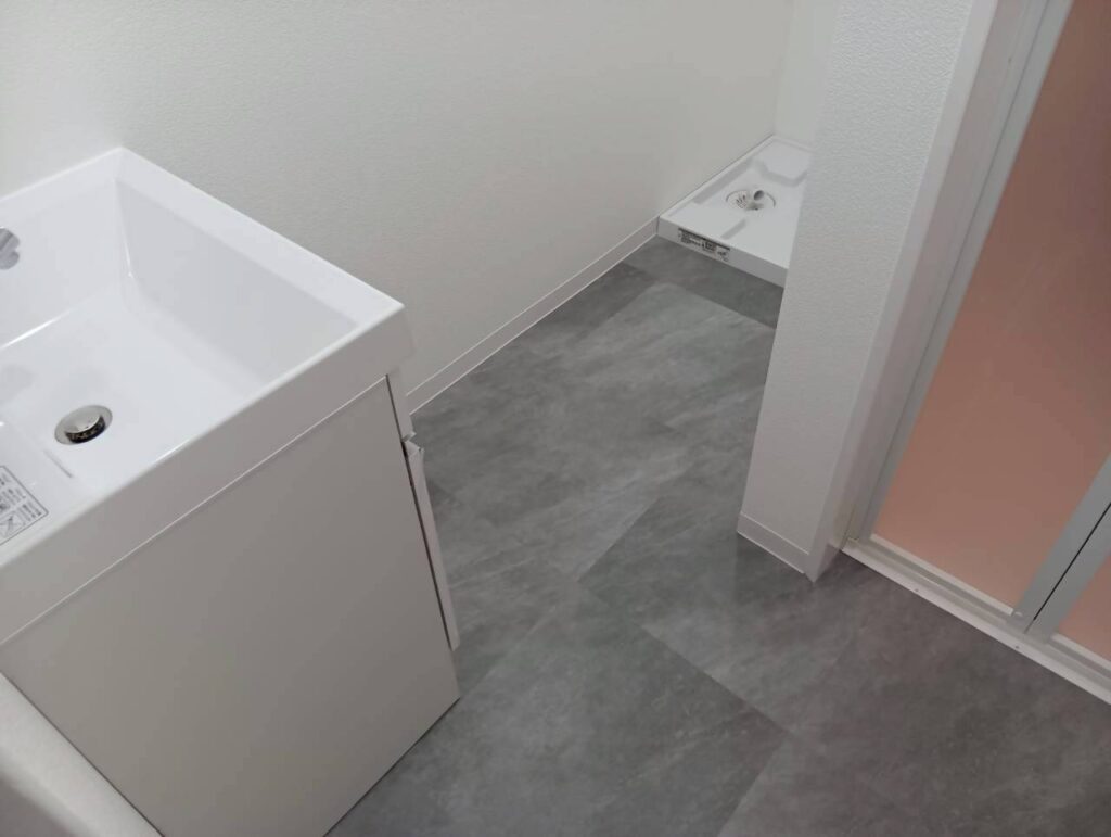 白を基調とした内装にグレーのフロアタイルを合わせることで、清潔感あふれるモダンなサニタリールームへと生まれ変わりました。